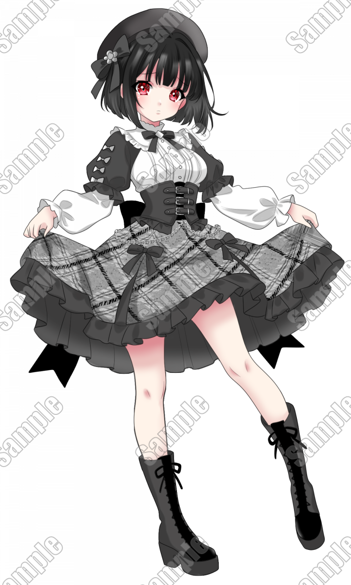 フリルたっぷりのモノクロ衣装を着てベレー帽を被った、黒髪赤眼の女の子の立ち絵です。