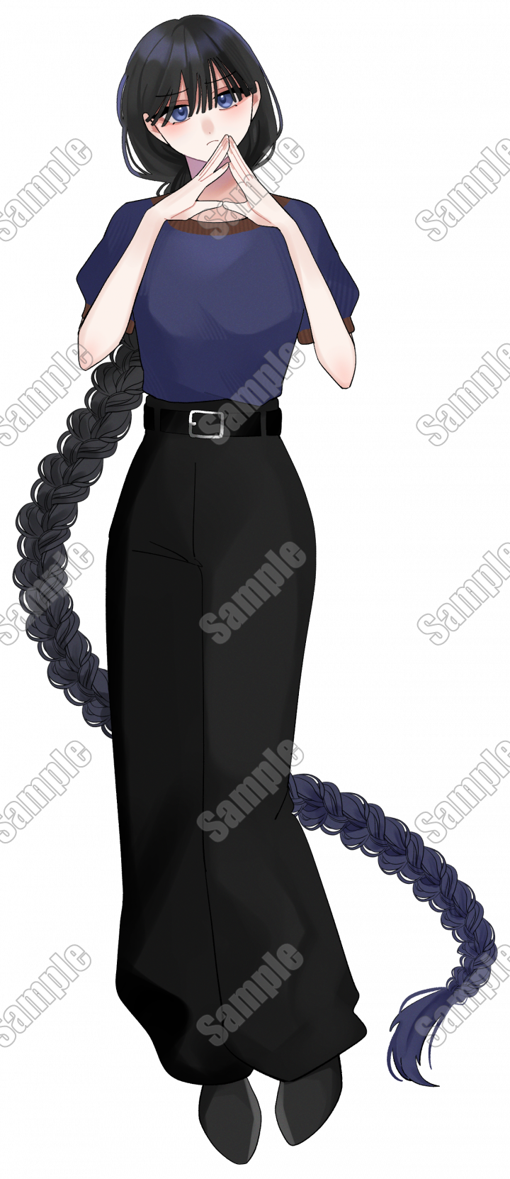 内容 | シンプルな服装の黒髪を三つ編みにした女性の立ち絵です。 |