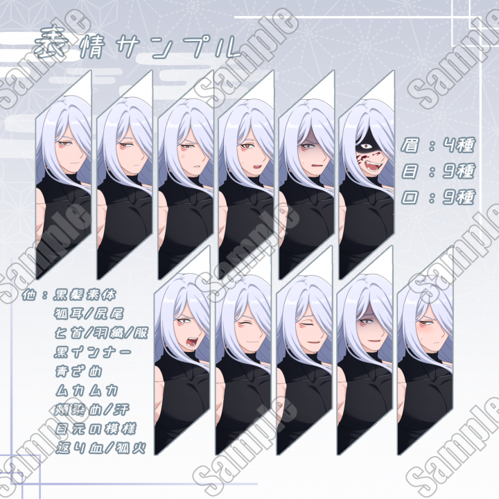 サンプル画像に使用している表情11種(黒髪差分含む)