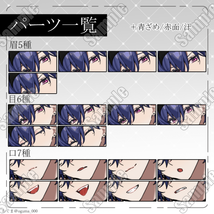 眉5種/目6種/口8種/赤面/青ざめ/汗