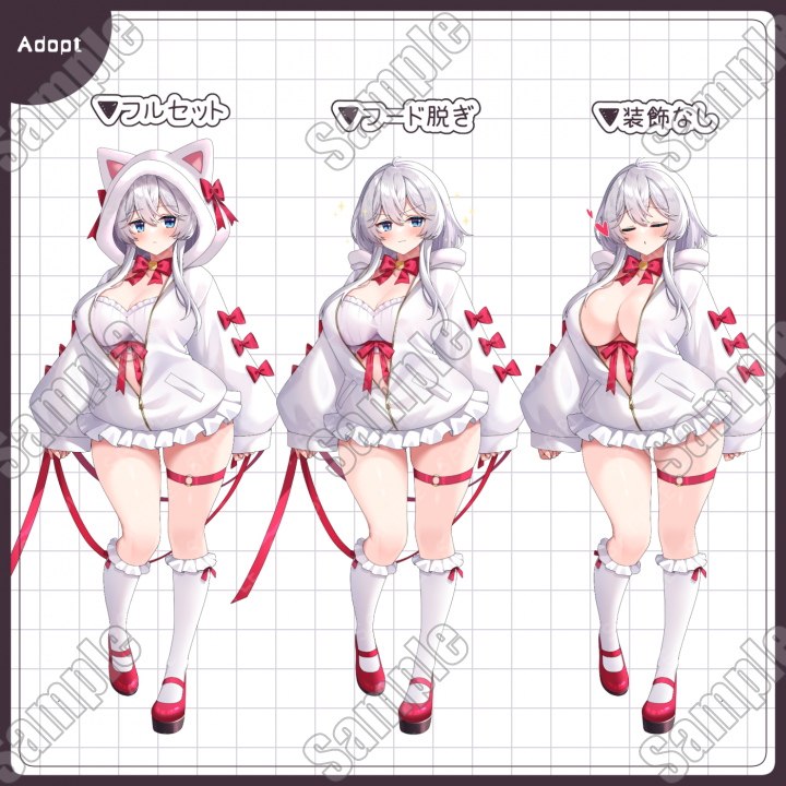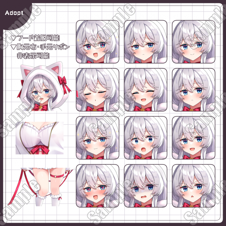 ・その他:10種(赤面、赤面2、リボン、胸元布、フード脱ぎ、フード、あせ、青ざめ、きらきら、ハート)