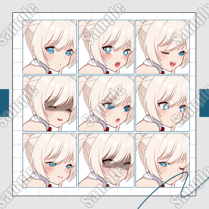 (にっこり、閉じ、通常、逸らし、じと目、じと目逸らし、見開き、見開き逸らし、見開き上目)