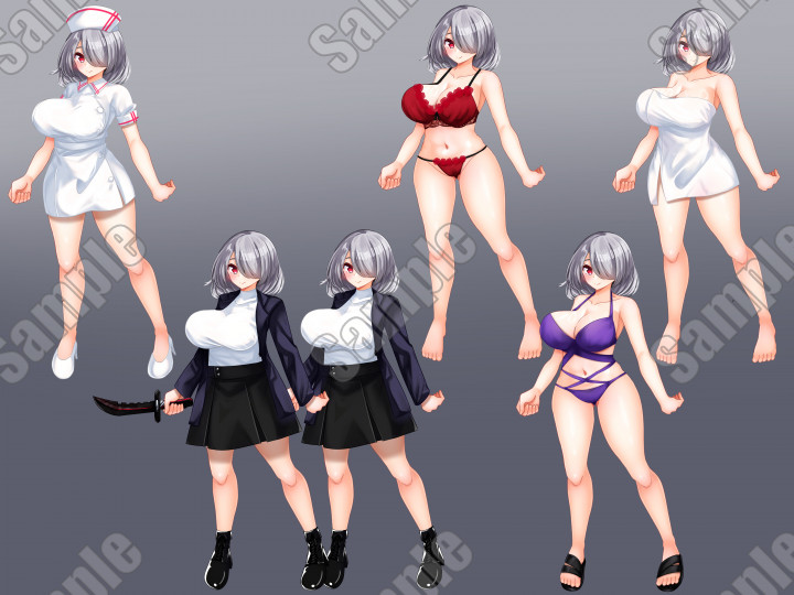記載パーツを付けたり外したり(表情パーツ・体パーツを表示、非表示)組み替える事で多くの差分を作成可能です。
