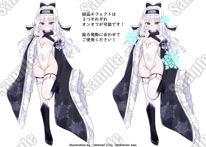 検索用:白髪/銀髪/ロングヘア/ウェーブヘア/ファンタジー/忍者/フリル/雪属性/ニーハイ/表情切り替え/バニー服/エフェクト |