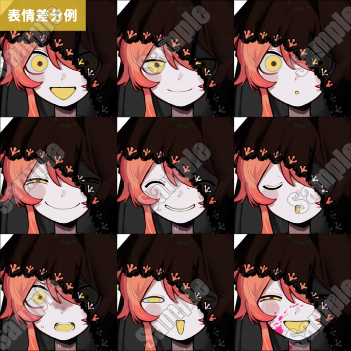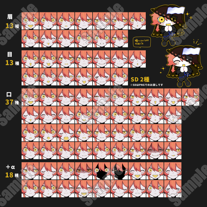 ・出品ページ見本画像(表情差分見本/表情差分各パーツ早見表/着脱パーツ説明表)