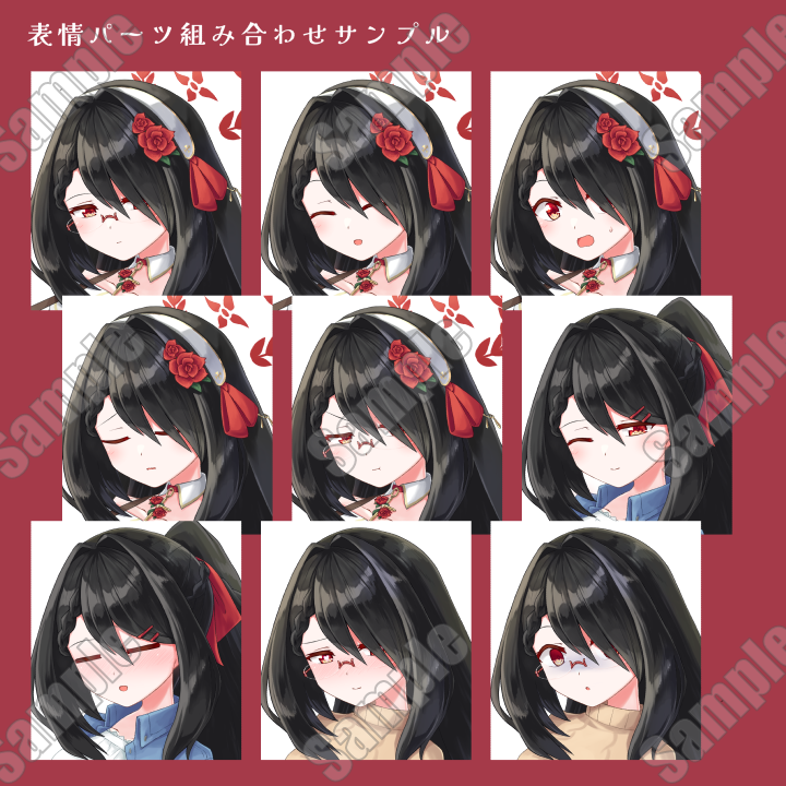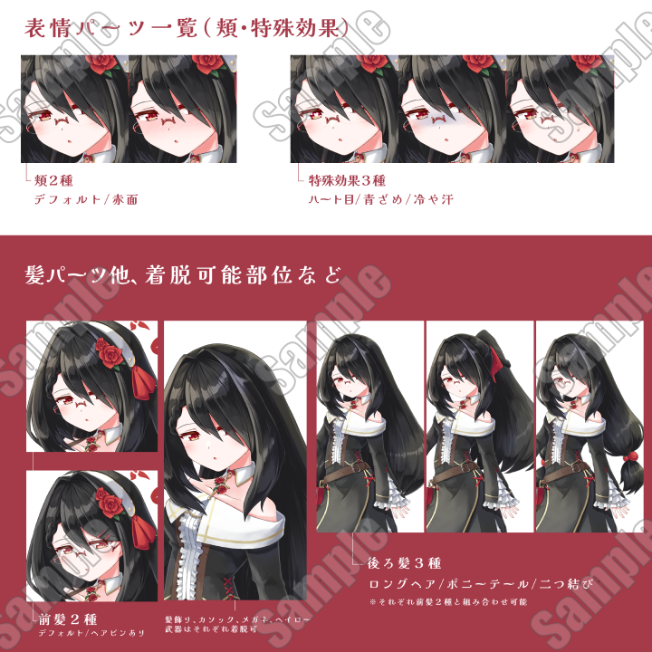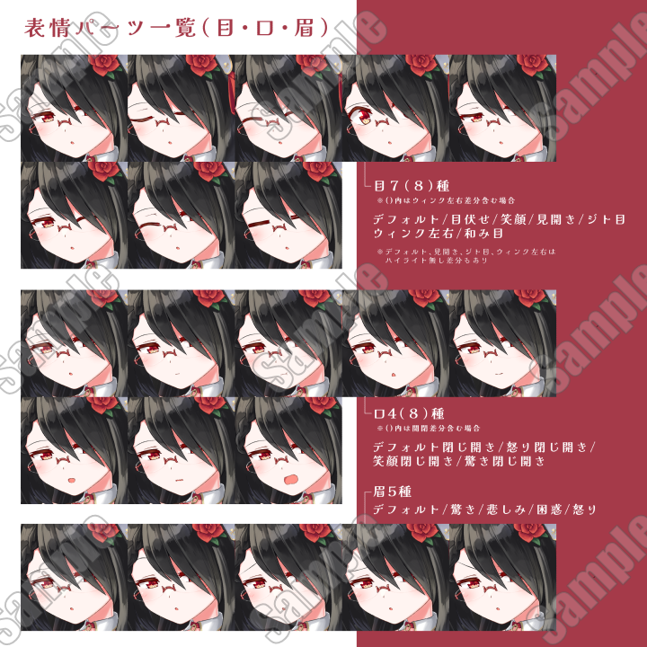 表情:眉5種、目7(8)種、口4(8)種、頬2種、特殊効果3種