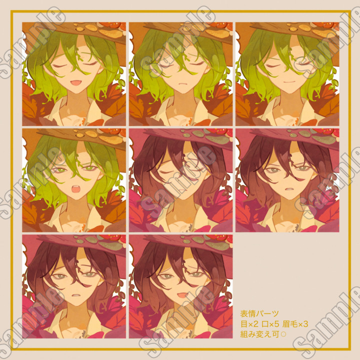 表情はPSDデータ内のレイヤーがそれぞれ別れておりますので自由に組み換えて保存しご利用ください。