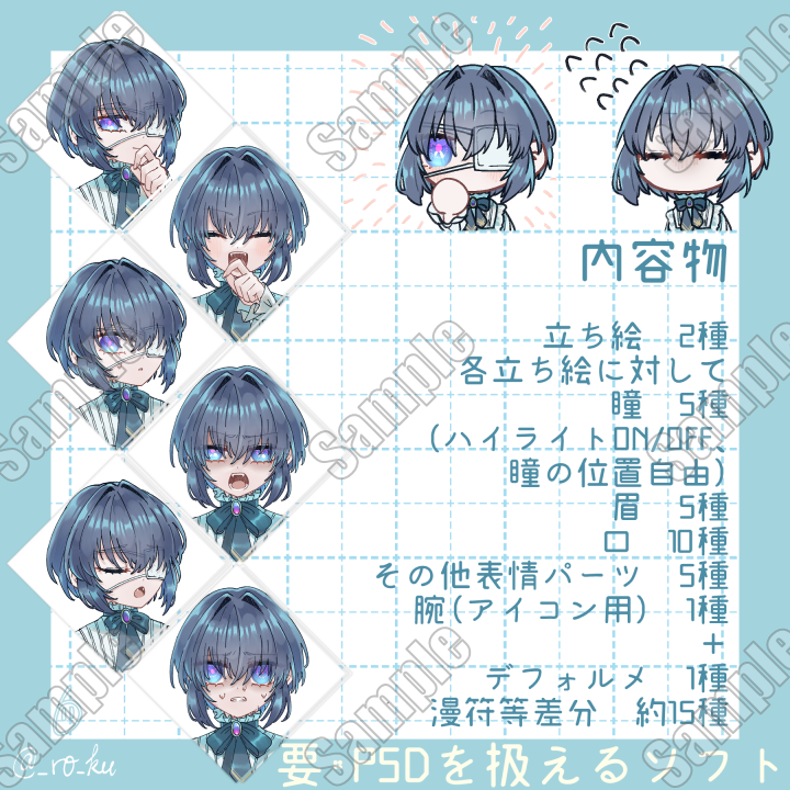 | 内容 | 以前描いたキャラクターのリペイント立ち絵+新規立ち絵+おまけのデフォルメのセットです。 |