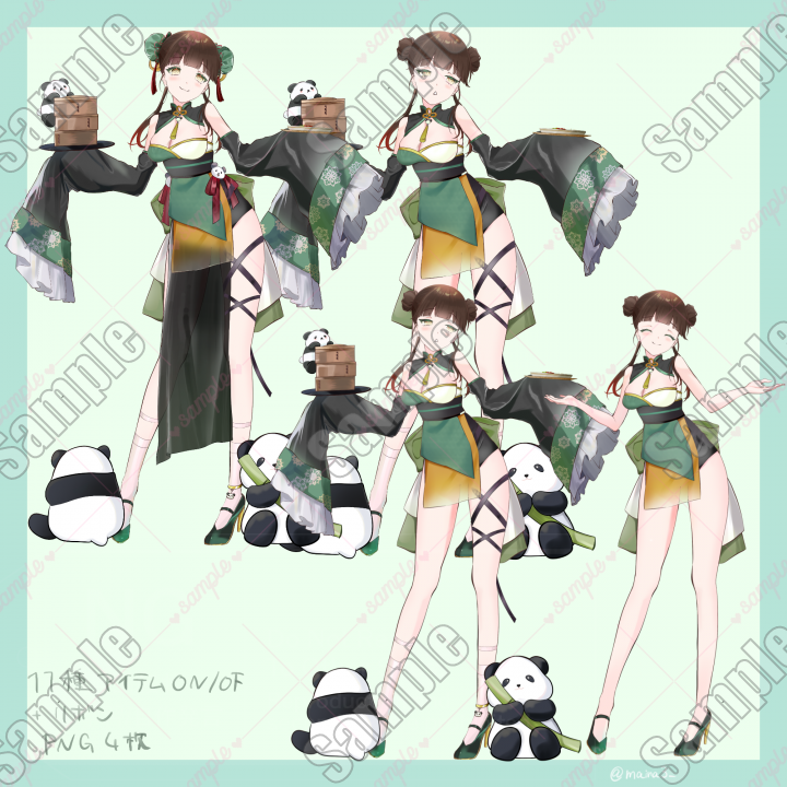 (靴下,ベルト,透け布,足飾り,袖,中華粥,お皿のパンダ,蒸篭,腰パンダ,シニヨンカバー,パンダ二匹)