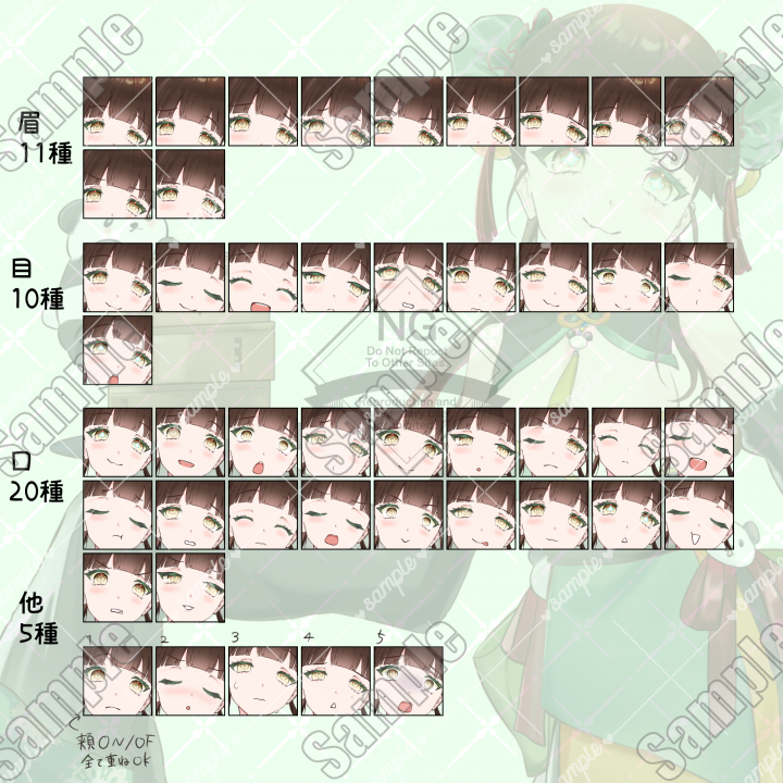 目10種/眉11種/口20種/その他5種(青ざめ1種,汗2種,頬2種)