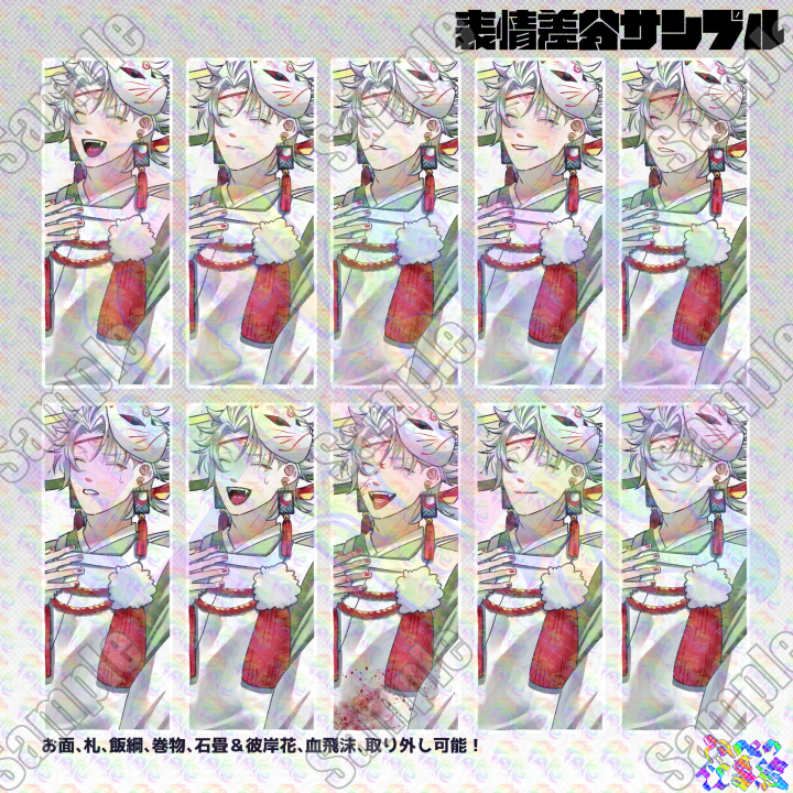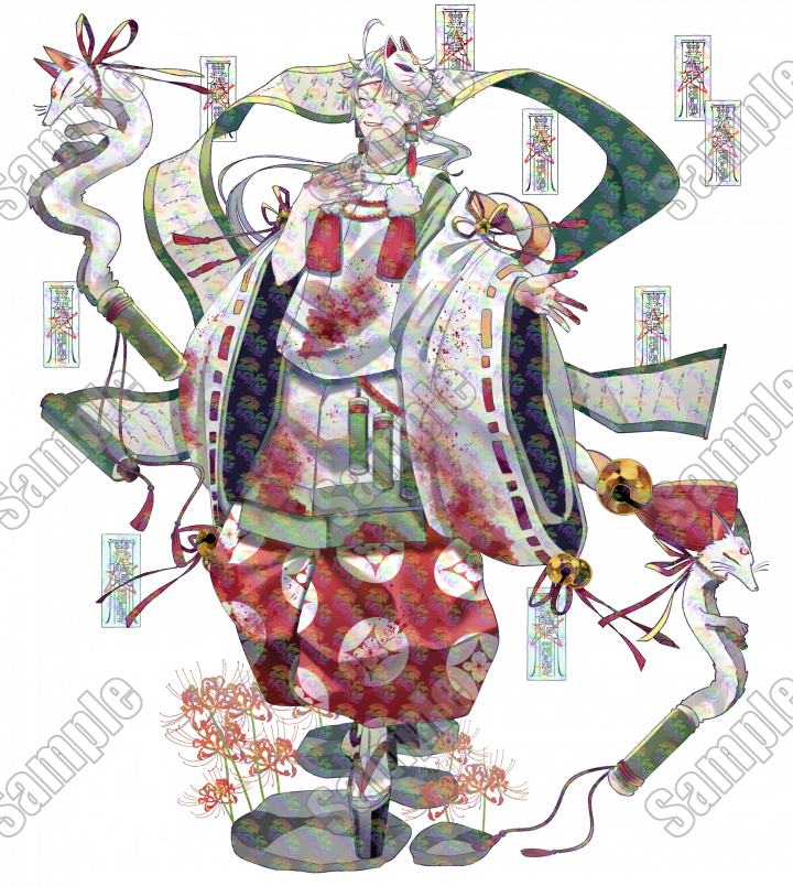 お面、札、飯綱、巻物、石畳&彼岸花、血飛沫、取り外し可能。