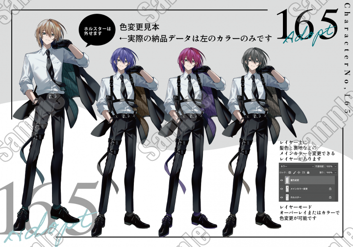 ・髪色とスーツの裏地などメインカラーを変更出来るレイヤーがpsdデータの1番上にあります。
