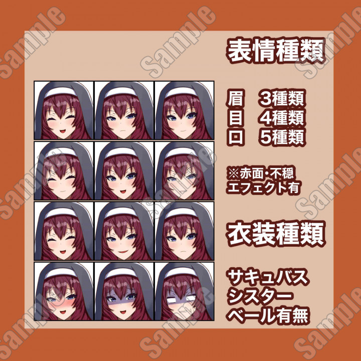 □ PSD(表情の組換え自由60種+赤面・不穏エフェクト&サキュバス・シスター衣装+ベール有り無し、タイツ破れ、素体)