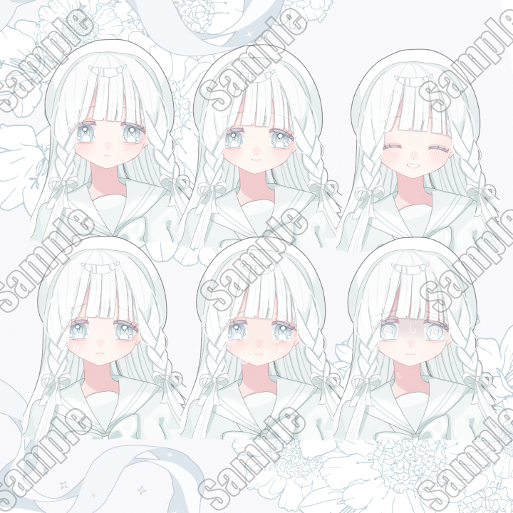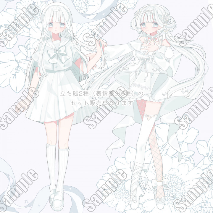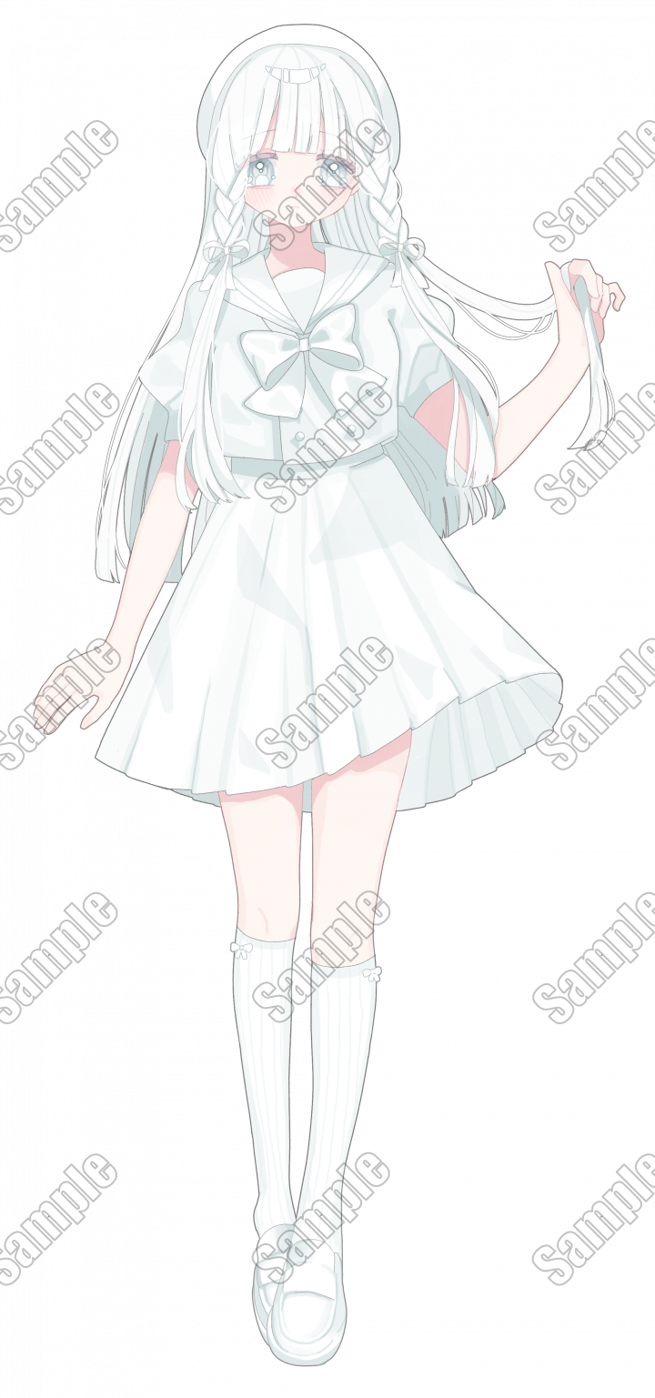 | 内容 | 真っ白なセーラー服とアイドル衣装の女の子の立ち絵と表情差分のセットです。 |