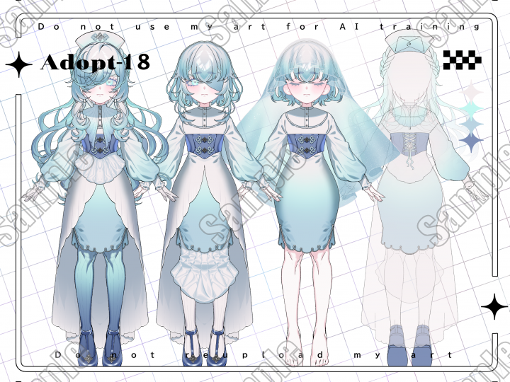 淡いブルーを基調としたナースキャップ&ベール&眼帯等、小物で遊べるデザインのキャラクターです。