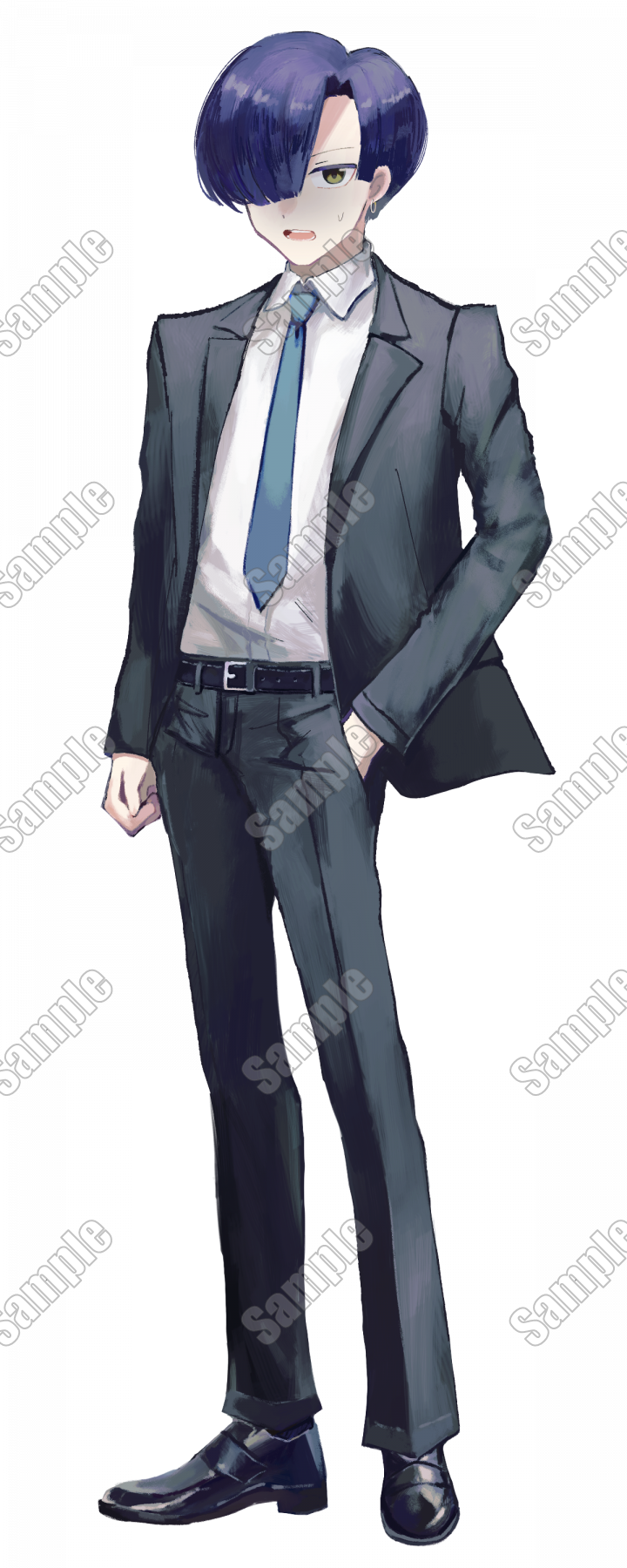 青髪片目隠れの男性です。