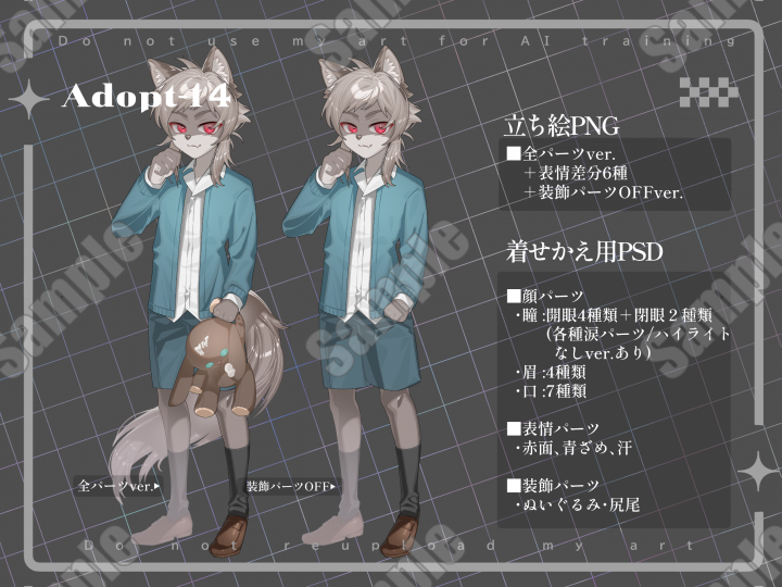 | 内容 | ぬいぐるみを抱えたケモ度やや高めのケモキャラクターです。 |