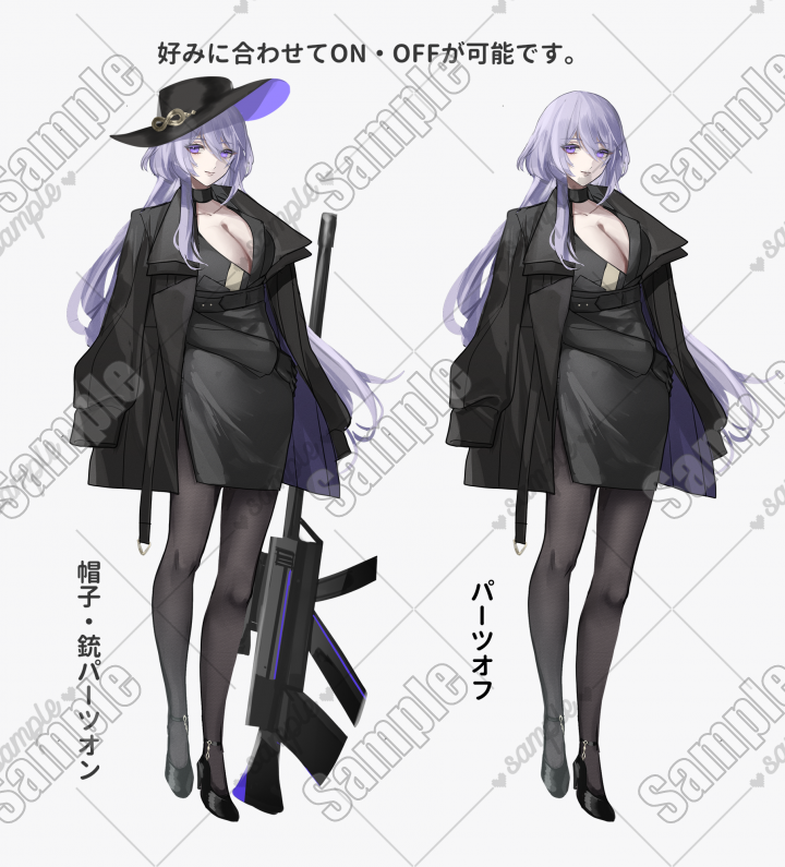 | 内容 | スーツ女性の立ち絵です。銃・帽子等のパーツはON・OFFが可能です。 |