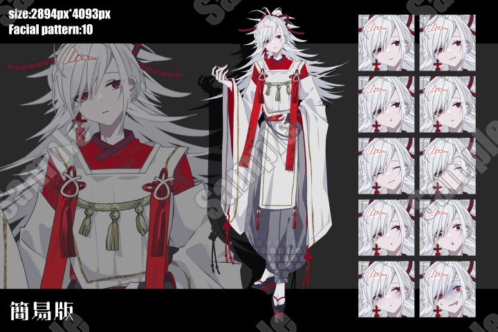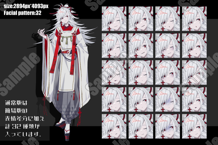 | 内容 | 白髪赤眼神主青年【布顔差分アリ】立ち絵素材 立ち絵素材です。 |