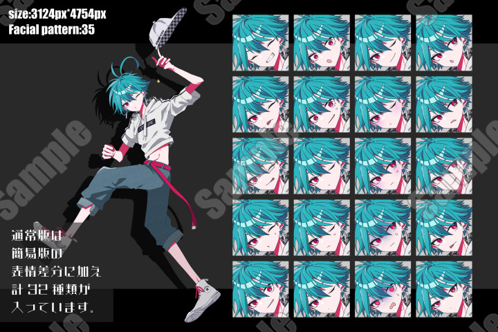 | 内容 | キャップを持った活発そうな少年【青緑髪赤眼】 立ち絵素材です。 |