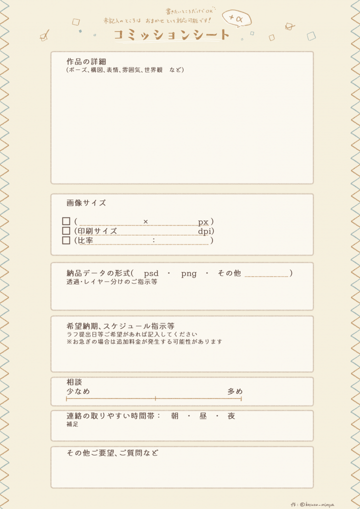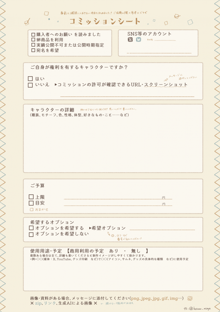 コミッションで確認しておきたいことをまとめてみました。DL・書き込みOKです👌 1枚目:できるだけ回答してほしい項目をまとめました。こちらの項目を文面で送ってくださっても◎ 2枚目:共有しておくと スムーズに作業が進められそうな項目をまとめました。未記入の部分は おまかせ で対応できます! ご依頼の際の参考になれば幸いです✨ ▽ダウンロードできない際は、こちらから https://x.com/kosuzu_minya/status/2014965438611087599?s=46&t=h3yypBlx1e6A-In_t1DUbQ