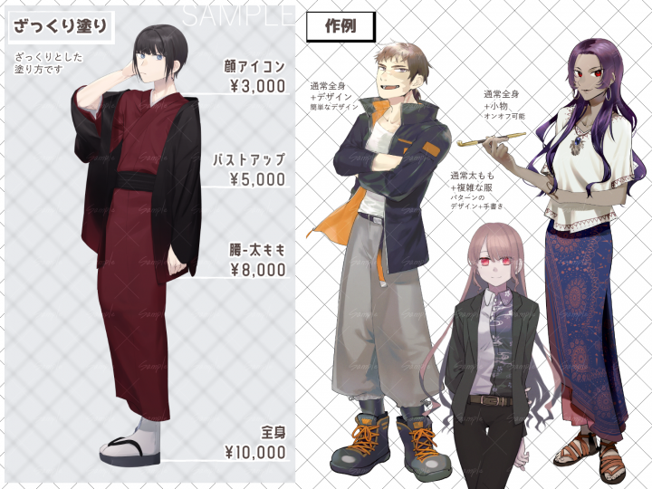 主にTRPGやゲーム、動画の立ち絵用のイラストを制作致します。 |