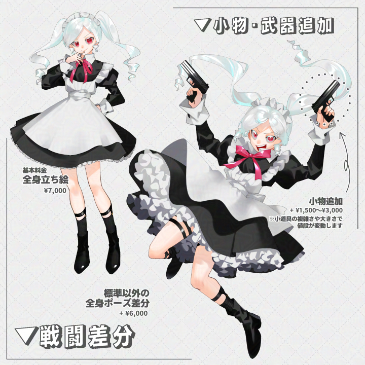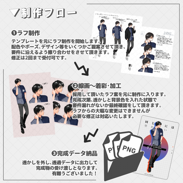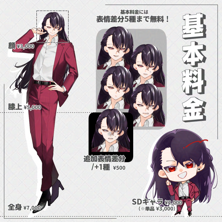 | 内容 | TRPG・SMS・ゲーム・配信活動、その他制作物等にてご利用可能な立ち絵・イラスト制作を承ります。 |