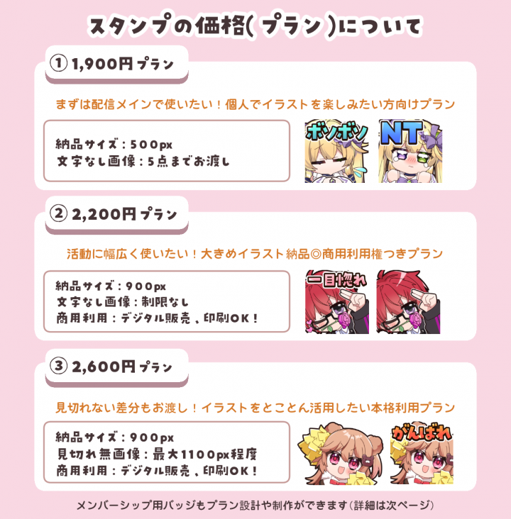 今回、YouTubeメンバーシップのスタンプを作成していただきました! 大まかに文字と感情をお伝えした後、2パターン提案していただけたり、サービスの良さを感じました。 作画についても大変可愛らしく、見ていてこちらも元気もらえるような豊かな感情表現でした。 この度は依頼を引き受けていただき、本当にありがとうございました!