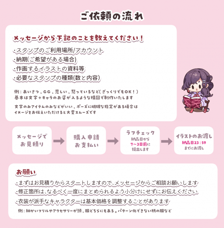 短期間だったにも関わらずとても素敵なスタンプイラストを描いていただきました! どれもすごく可愛くてお披露目が待ち遠しいです…! 丁寧かつ迅速なお取り引き、納品をありがとうございます! また機会がありましたら是非よろしくお願い致します。