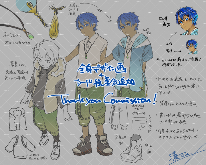 この度は以前描いていただいた子の差分と全身デザイン画をありがとうございました! 以前、ちょっと特殊な依頼をさせていただいたのですが、それを踏まえつつ、素晴らしいデザインを描いていただきました!厚着まで…!冒険の想像が膨らみます! またよろしくお願いいたします!