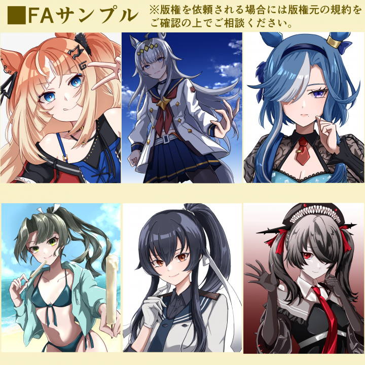 一枚絵/立ち絵(TRPG)/三面図/アイコン/ヘッダー/SD/衣装デザイン/夢絵/歌ってみた動画用イラスト/同人/成人向け