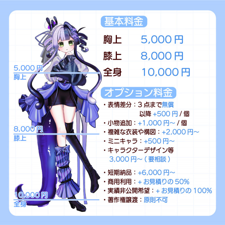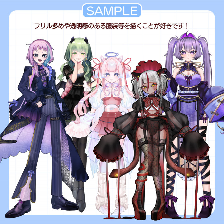 ご依頼についての相談や修正依頼に対して、丁寧なご対応をいただき、安心して依頼することが出来ました。 自分の想像していた以上に素敵なミステリアスで美しいキャラクターを仕上げていただき、うれしく思っています。 この度はありがとうございました!