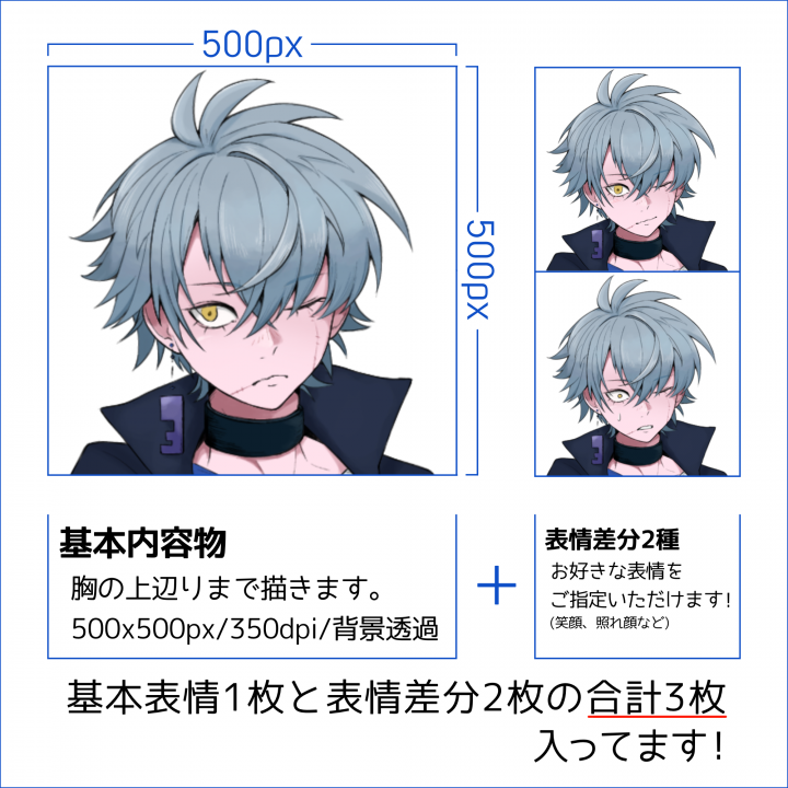 内容 | TRPG用立ち絵・動画・SNSアイコンなどにお使いいただけるバストアップイラストを制作いたします。 |