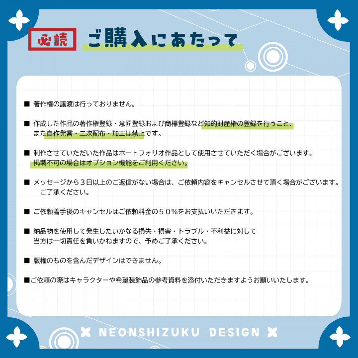 購入者へのお願い | ▫ご購入にあたって(添付画像)の内容を了承の上ご依頼ください。 |
