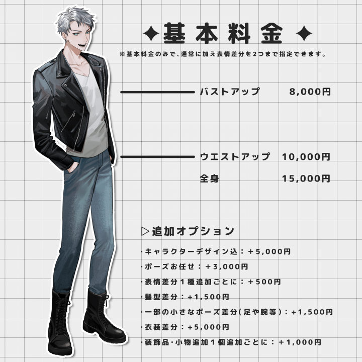 ・併せ立ち絵等、2人以上の場合は1人分の描写範囲と同じ金額を追加でいただきます。 |