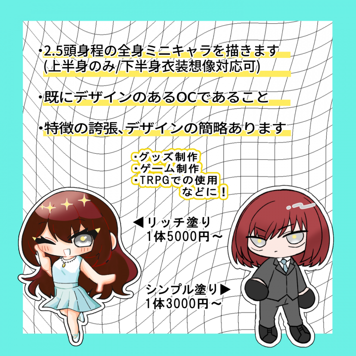 ・ご依頼者様ご自身/ご依頼者様のご友人などの身近な方のオリジナルキャラクター、または活動者様ご本人のみの受け付けになります。 |