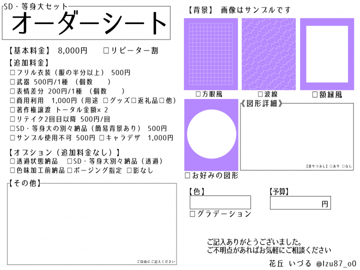 オリジナルのキャラクター、自身のアバターのお姿のみの受付です。 |
