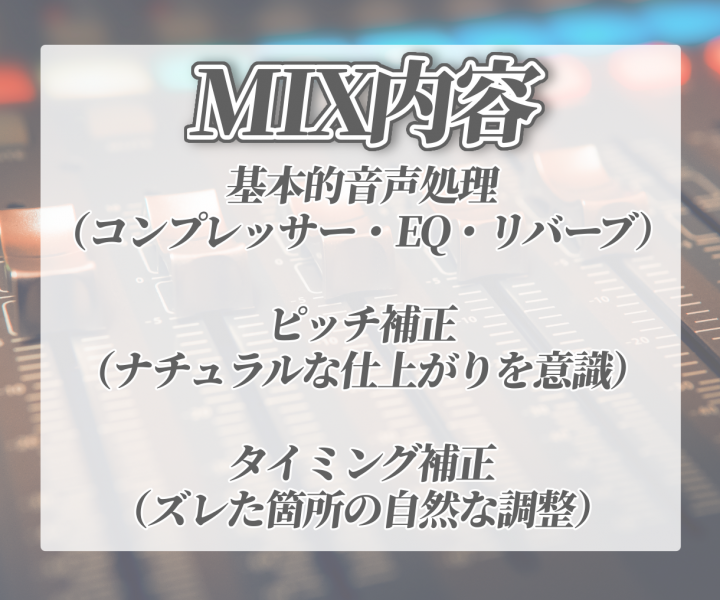 ・MIX前のVo音源とinstの準備をお願いいたします。(WAV推奨です!) |