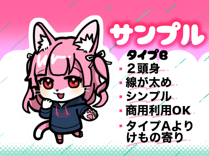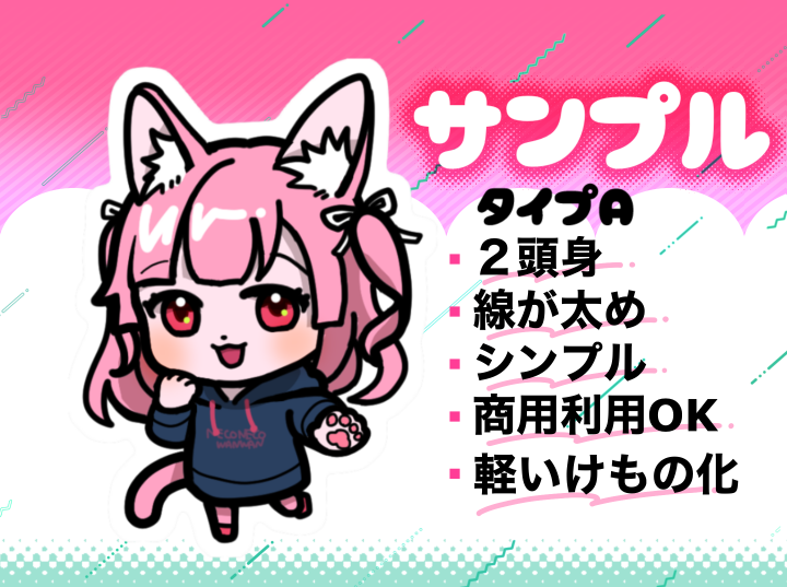 内容 | けもの化したシンプルかわいい2頭身キャラのイラストを作成します。 |