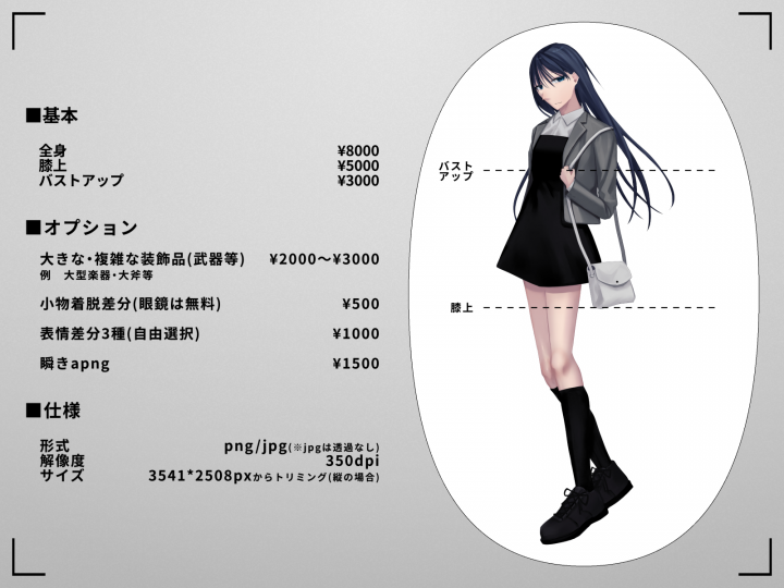 TRPGセッション・リプレイ動画・ゲーム・定ゲなどでお使いいただける立ち絵を制作させて頂きます。 |