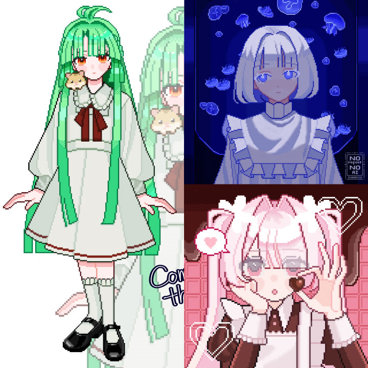 ・ドット絵の特性上、細かい表情や複雑な装飾の描写には限界がありますため、一部デザインを簡略化して制作する場合がございます |