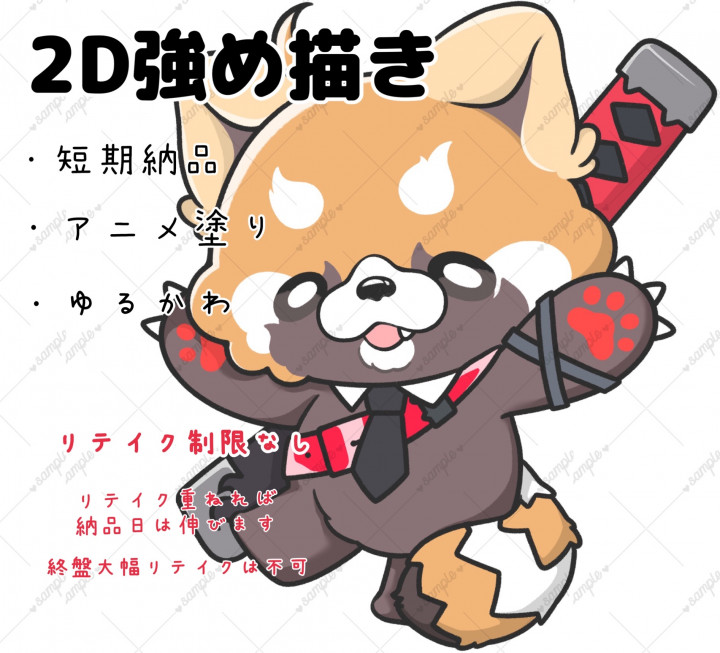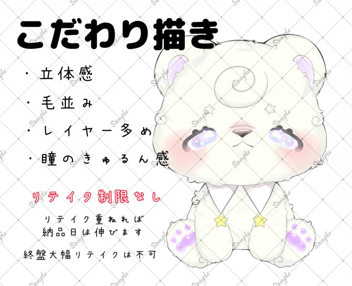 リテイクなど回数制限は殆どなしで納得のいく子を生み出せたらなと思います。(リテイクが多いと納品日は長くなります) |
