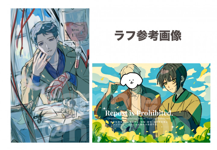 ご希望のキャラクターをもとに、カップルイラスト、うちよそのイラストを制作します!完全お任せになりますのでポーズや構図などの指定ができません。雰囲気の指定は可能です! |