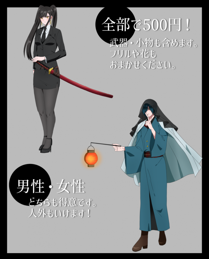 TRPG用の立ち絵を作成いただきました。 修正依頼にも迅速にご対応いただき、納品希望日よりもかなり早めに納品いただけました。 お任せでお願いした武器のデザインもとてもかっこよく仕上げてくださりました。 ありがとうございました。