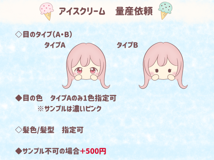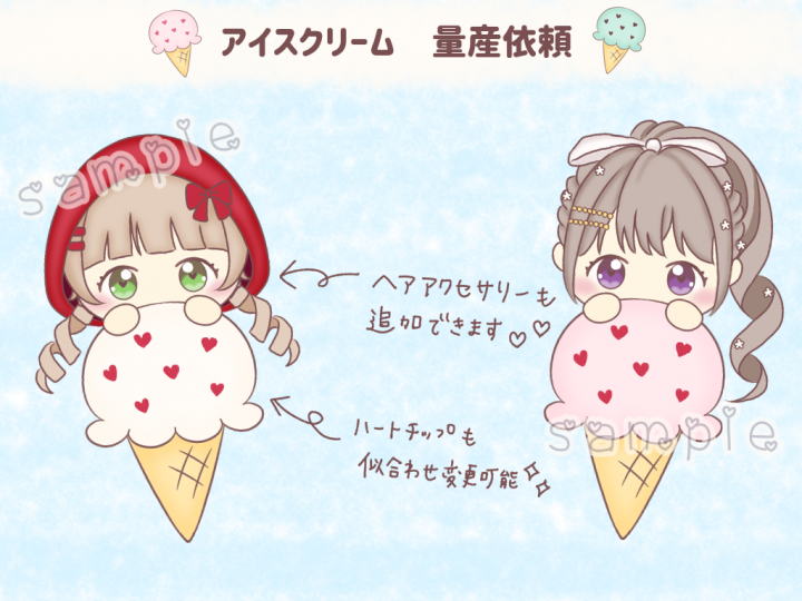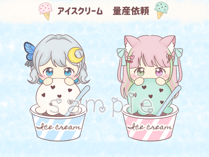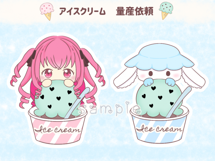 夏にぴったり!カラフルなアイスの上に乗ったかわいいミニキャライラストはいかがですか? |