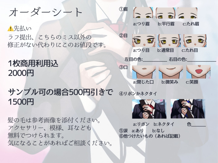 2枚めのオーダーシートの記入、もしくはオーダーシートに書いてある数字とアルファベット、目の色涙の有無をお送りください。 |
