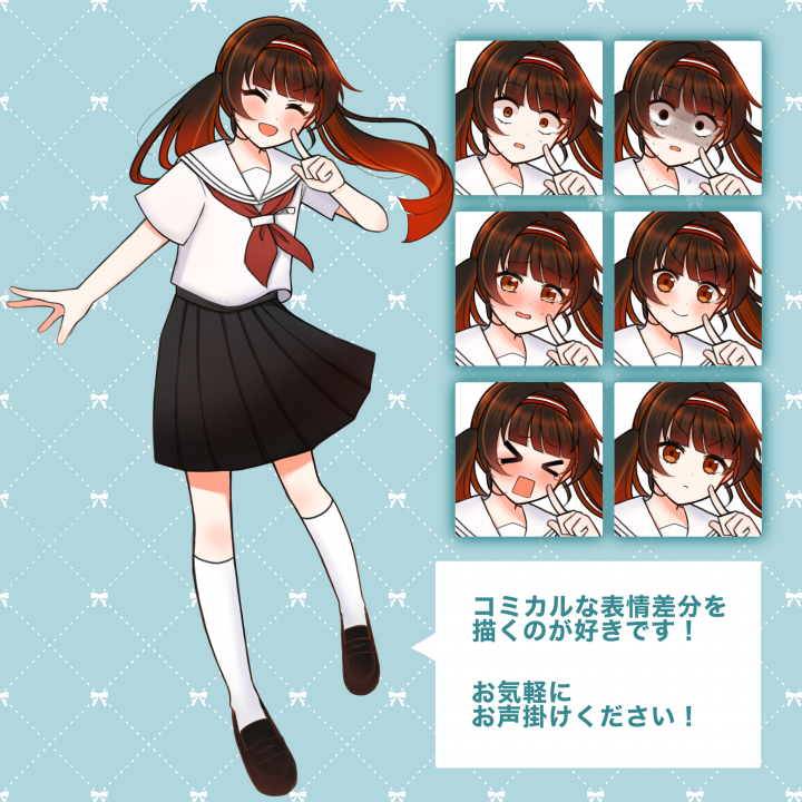 リテイクは2回まで承っております。修正希望がある場合はなるべくひとつの連絡にまとめてお伝えください。 |