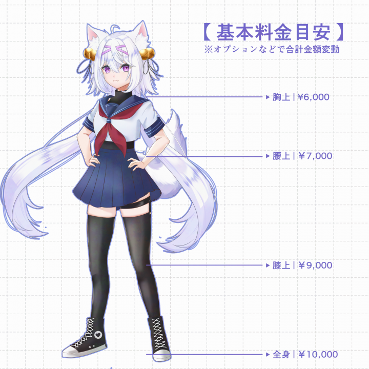 TRPG、創作、ゲーム、配信などの用途でご利用可能な全身立ち絵イラストを制作します。 |