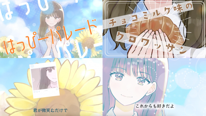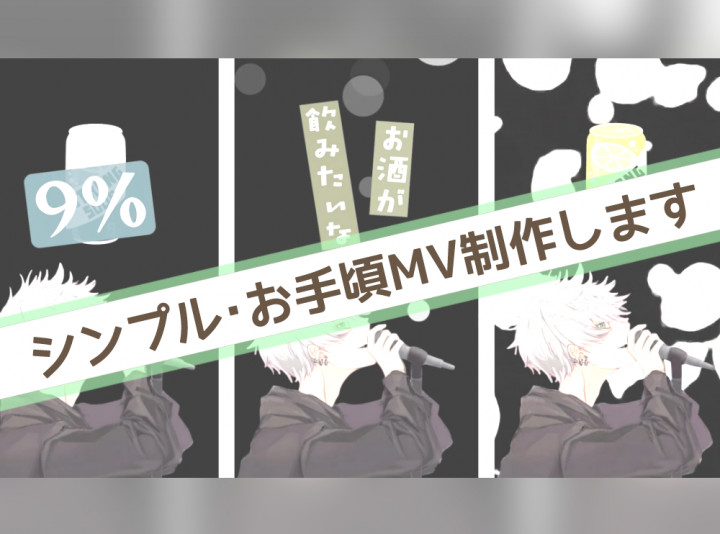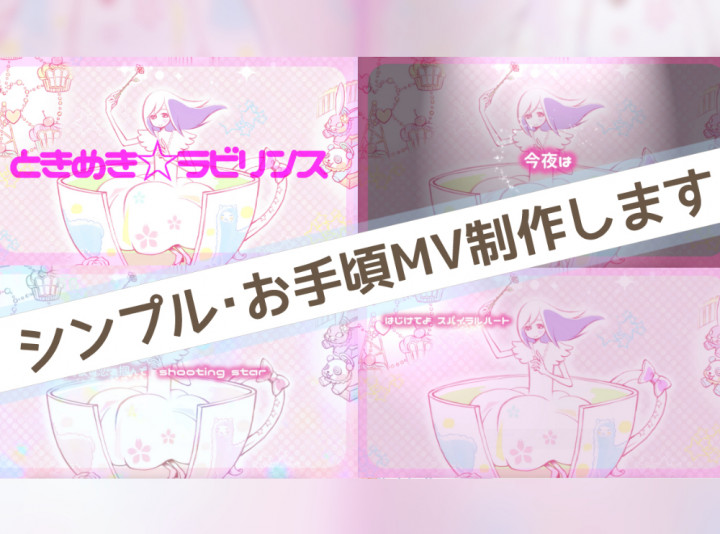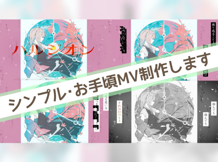 【静止画像(イラスト、写真などご用意ください)+歌詞+簡易エフェクトで、お手頃料金のシンプルなMVを制作します!】 |