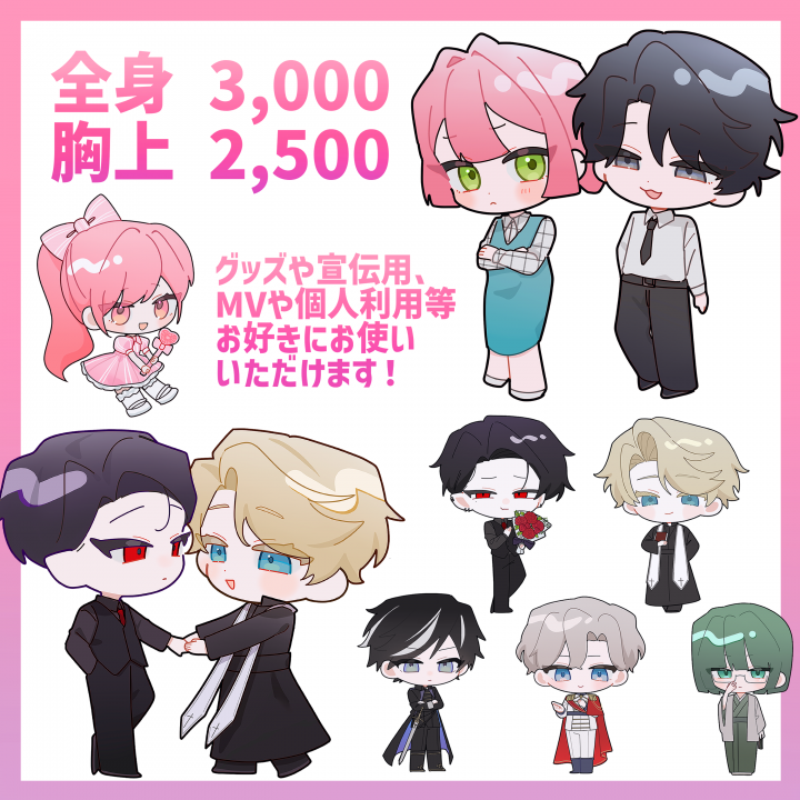 ミニキャラを描きます!様々な用途にご使用いただけます。現在1週間以内の納品が可能ですのでぜひご活用ください(ご依頼される人数によっては時間がかかる場合があります)。 |